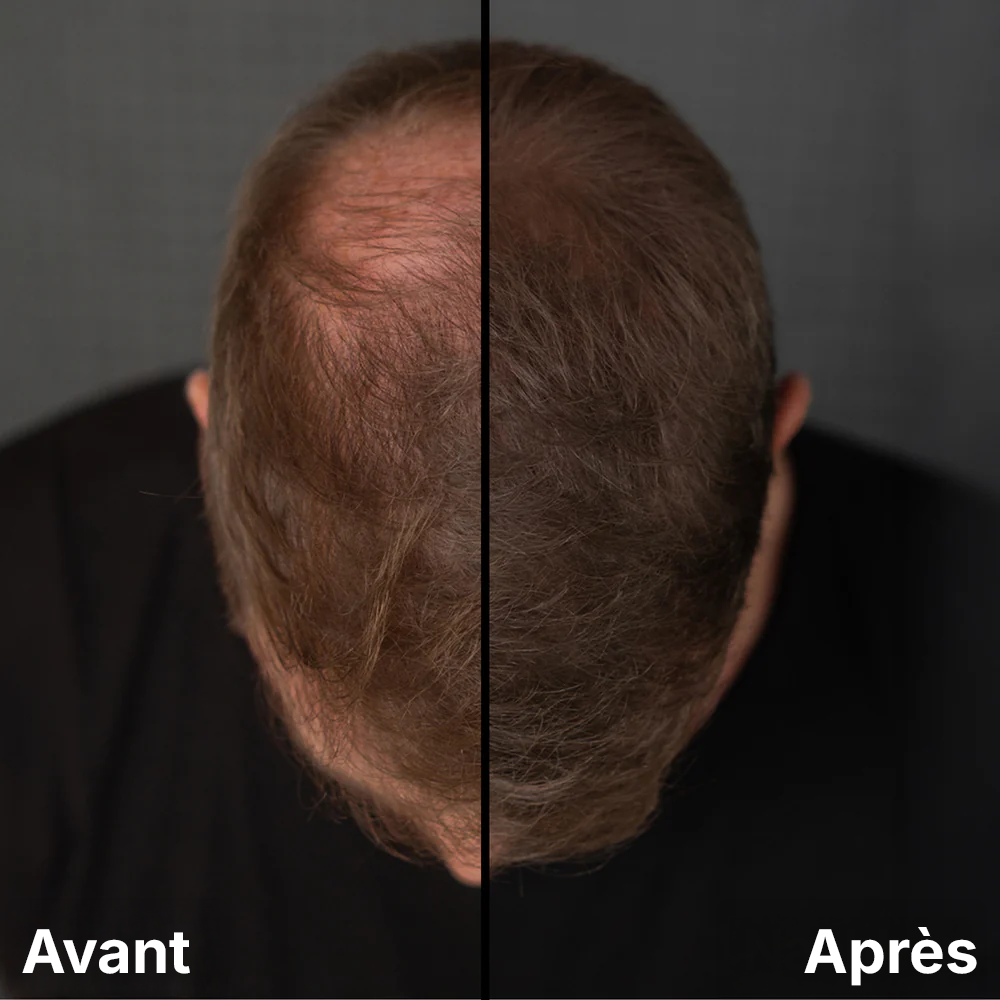 Même sur les zones qui paraissent chauves, il existe souvent de petits cheveux fins ou clairs. La poudre s’y fixe naturellement pour combler visuellement les manques et créer un effet de densité homogène et naturelle — même en cas de perte de cheveux avancée.